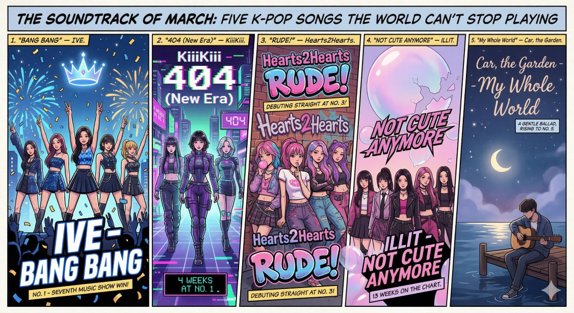 The Soundtrack of March: Five K-Pop Songs the World Can't Stop Playing   There's a moment every music lover knows — when a song comes on and the room shifts. Conversations pause, heads turn, and someone inevitably says, "Wait, what is this?" Right now, in March 2026, K-pop is full of those...